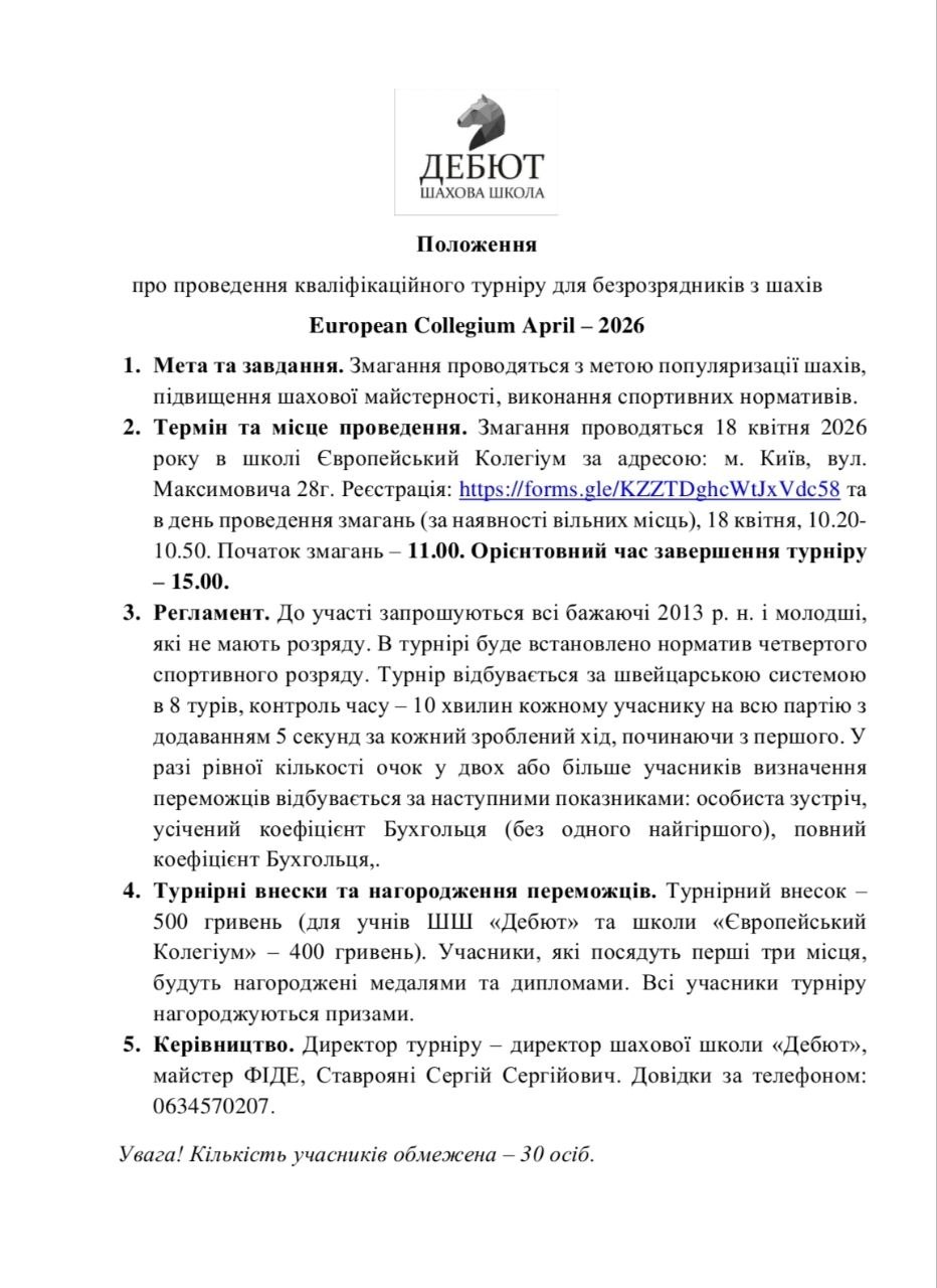 03.04 Додано анонс турніру «European Collegium для 4 р.» (18.04, Київ); 03.04 Додано анонс турніру «European Collegium для б/р» (18.04, Київ); 01.04 Додано анонс турніру «на підтримку ЗСУ» (5.04, Буча); 30.03 Додано анонс заходу «Академія чемпіонів у СВІТОГЛЯДІ» (04.04, Київ); 30.03 Додано анонс турніру «Першість Києва серед ветеранів» (04-22.04, Київ); 28.03 Додано анонс турніру «Chess time ІІ"» (4.04, Буча); 19.03 Додано анонс турніру «Чемпіонат України u12» (1-10.05, Чернівці); Поточні рейтинги ФІДЕ Наші партнери