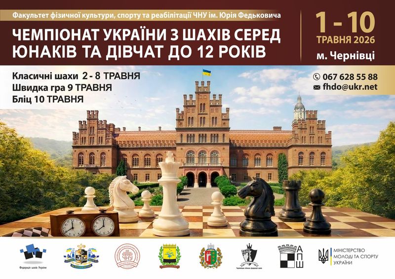 До уваги українських шахістів!Федерація шахів України розпочинає формування заявки на участь у чемпіонаті світу з швидких та блискавичних шахів серед юнаків та дівчат вікових категорій U8 - U18, який відбудеться у Врнячка Баня (Сербія) 14–21 квітня 2026 року.Для включення до офіційної заявки необхідно до 19 березня 2026 року заповнити реєстраційну форму. З усіх питань, що стосуються організації поїздки, а також можливої подорожі у супроводі голови української делегації, прохання звертатися за електронною адресою: - Пархоменко Дмитро, голова української делегації, +380684359741, dmitrijparhomenko21@gmail.com Увага! Планується включення до Наказу Мінмолодьспорту на компенсацію витрат на проживання + внесок для чемпіонів ЧУ 2025 з бліцу та рапіду (ДО 8-12 та ДО 18 років) і чемпіонів юнацьких ЧУ 2026 з бліцу та рапіду (ДО 14 та ДО 16 РОКІВ) які завершилися станом на 15 березня 2026 року. Список додається.
