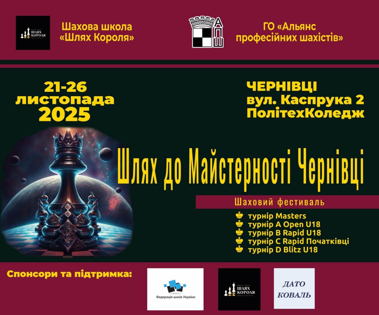 «Путь к мастерству Черновцы» Турнир «Masters» – турнир с возможностью выполнения нормативов МСУ и КМСУ и с подсчетом международного и национального рейтингов. Соревнования проводятся в дисциплине «классические шахматы» по командной шевенингенской системе в десять туров. Турнир «A» – открытый с расчетом национального рейтинга. Участники турнира будут иметь возможность выполнить спортивные шахматные разряды. Турнир «B» – рапид-турнир с расчетом рейтинга FIDE по рапиду. Турнир «C» – рапид-турнир для безразрядников. Участники турнира будут иметь возможность выполнить 4-й (первый юношеский) разряд.. Турнир «D» – блиц-турнир с расчетом рейтинга FIDE по блицу.