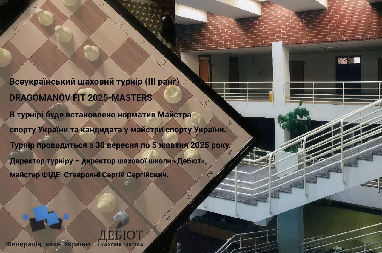 DRAGOMANOV FIT 2025-MASTERS Всеукраїнський шаховий турнір (III ранг) з нормами МСУ та КМСУ У Києві стартував Всеукраїнський 🇺🇦 шаховий турнір (III ранг) з нормами МСУ та КМСУ DRAGOMANOV FIT 2025-MASTERS. Турнір організований спільно за ініціативи Федерації шахів України та Шахово-шашкової школи Дебют на базі Національного Педагогічного Університету ім. Драгоманова. Змагання проводяться за шевенінгенською системою у 10 турів.