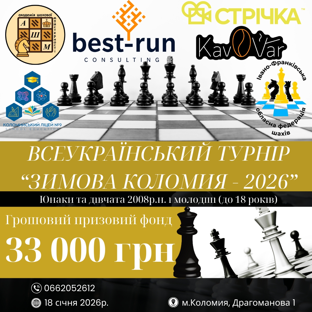 22.12 Додано анонс турніру «Кубок Києва пам'яті В.Чорновола» (27.12, Київ); 18.12 Додано анонс турніру «New Year DRAGOMANOV FIT з нормою КМСУ» (5-11.01, Київ); 15.12 Додано анонс турніру «Памʼяті воїна Романа БУЗІНСЬКОГО» (24.01, Кам'янець-Подільський); Поточні рейтинги ФІДЕ Наші партнери