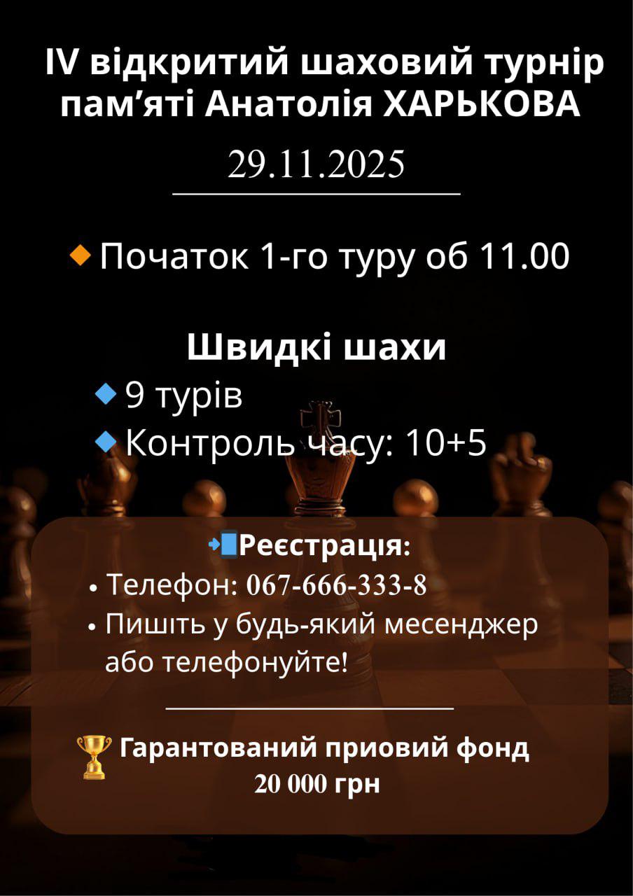 С 1 декабря 2025 г. начнутся курсы повышения квалификации тренеров, руководителей кружков по шахматам на тему «Педагогические и психологические основы подготовки тренеров, руководителей кружков по шахматам в условиях войны», которые будут проводиться онлайн и рассчитаны на 60 часов. Слушатели получат сертификаты, которые будут зачтены в повышение квалификации, поскольку полностью соответствуют требованиям пункта 13 Порядка повышения квалификации педагогических и научно-педагогических работников, утвержденного постановлением Кабинета Министров Украины № 800 от 21.08.2019 г. Сроки проведения с 01.12.2025 по 14.12.2025, место проведения: г. Киев, ул. Героев Обороны, 10, Национальный университет биоресурсов и природопользования Украины. Регистрационные данные от отдельных подразделений (областных федераций) ФШУ, шахматных клубов или школ отправлять на электронную почту: fantazir@ukr.net до 23.59 среды 26.11.2025, Оплата курсов - 2000 (две тысячи) гривен, количество слушателей ограничено и составляет - 30 человек. В заявке указать: 1. Фамилия, имя и отчество. 2. Номер идентификационного кода. 3. Номер телефона с Вайбер. 4. Ваша электронная почта. 5. Номер Новой почты для получения свидетельства. Руководитель - ЗАХАРЧУК Иван Романович, +38099-2621707.